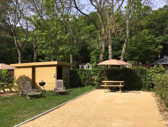 – Ein individuelles 4,5m² großes Gartenhaus mit Waschbecken (kaltes Wasser) und einer Kühl-Gefrierkombination