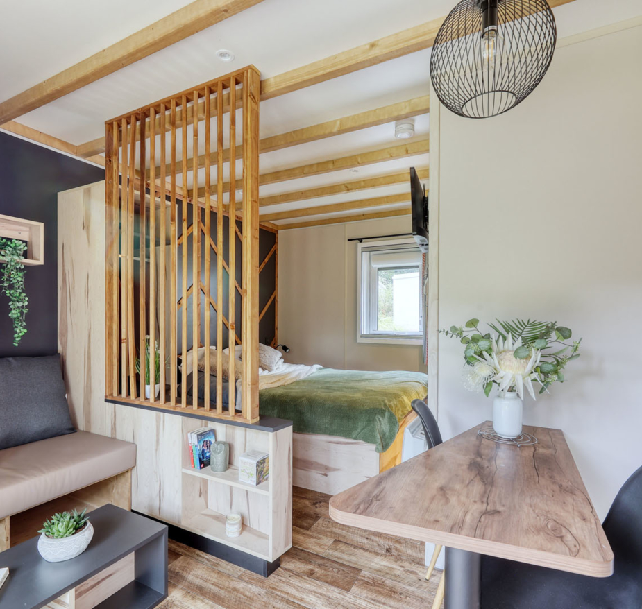 - Chambre ouverte sur le salon-salle à manger : 1 lit 140X190cm (couvertures et oreillers fournis), meuble penderie, 2 chevets luminaires avec prise usb intégrées, miroir, rideau avec tringle